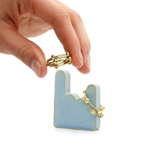 En leg med hænder, farver og attitude. DIGITS er små keramiske ringholdere formet som grafiske håndtegn – fra den klassiske pegefinger til rock-on og pinky.