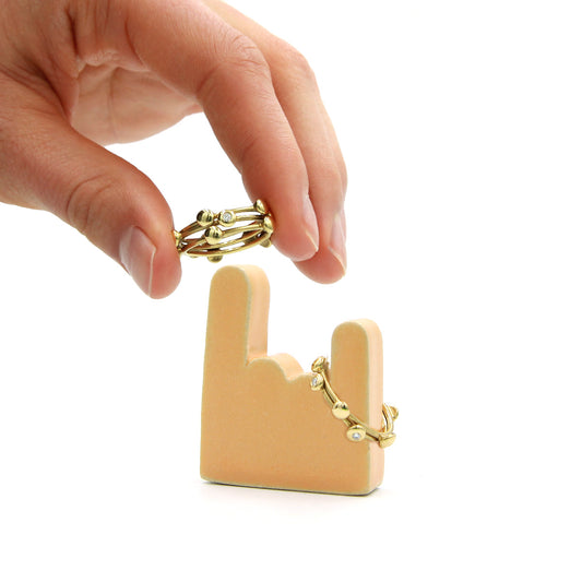 Hver finger har sin egen personlighed, og sammen danner de et lille farverigt selskab af hænder, der både pynter og holder styr på dine ringe.
