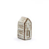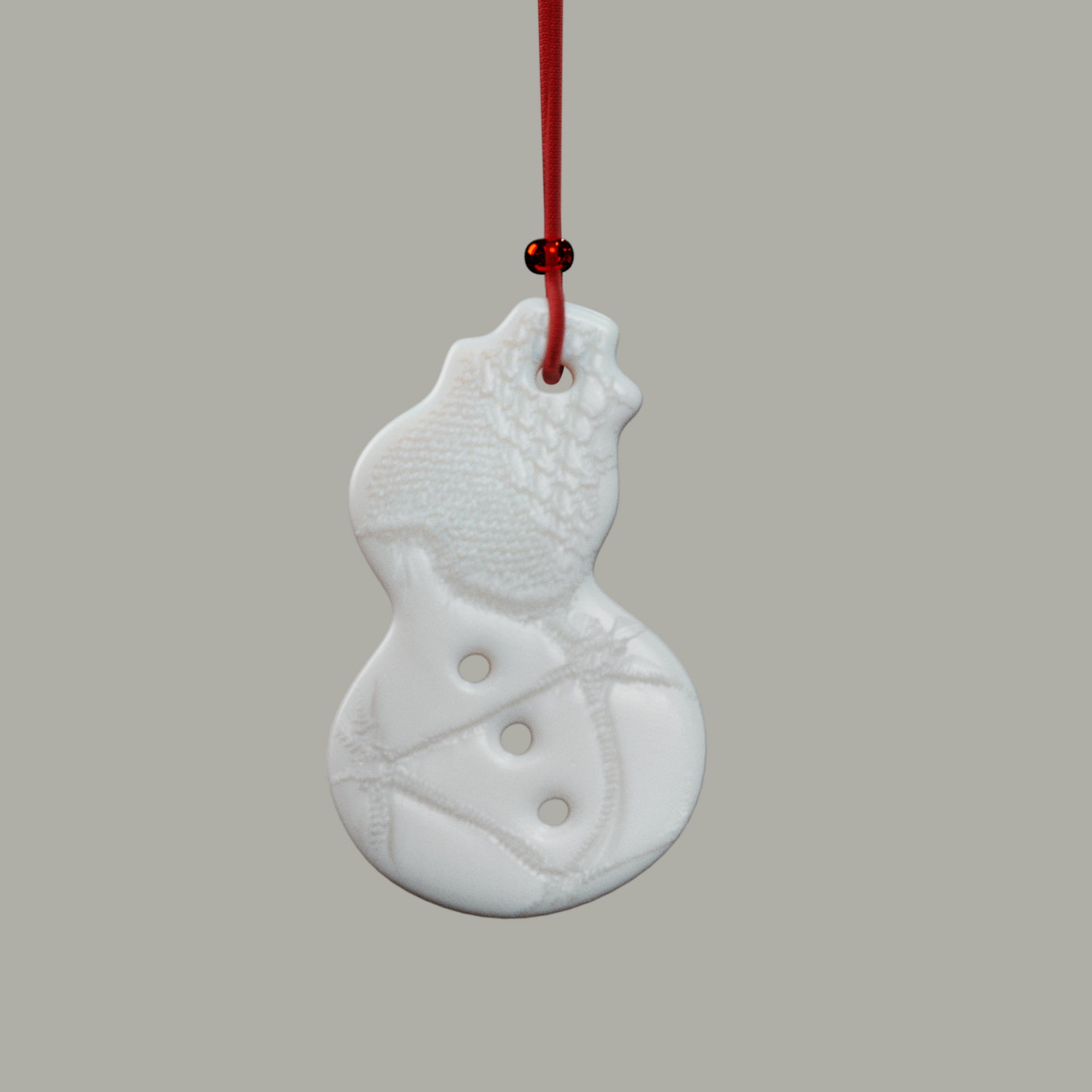 Schneemann aus weißem, unglasiertem Porzellan mit Prägung auf beiden Seiten. Oben wird die Nylonschnur mit einer kleinen gestreiften Perle zusammengehalten.
