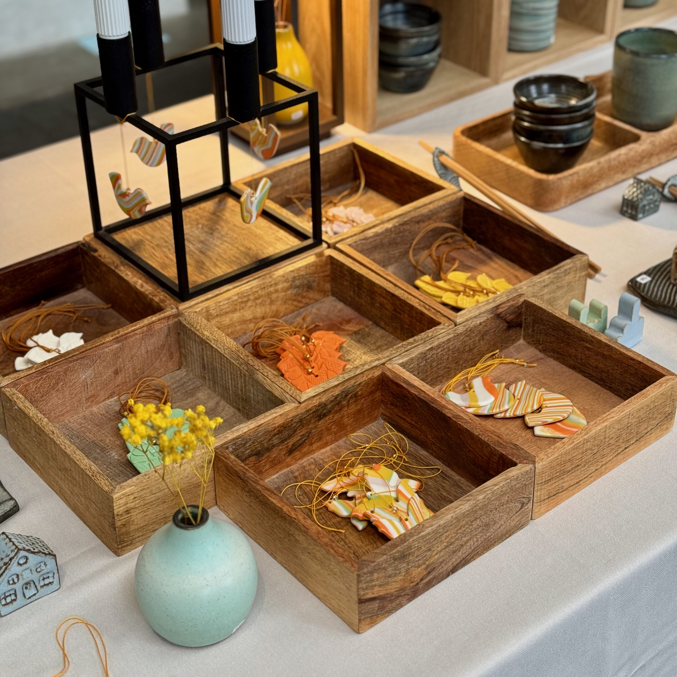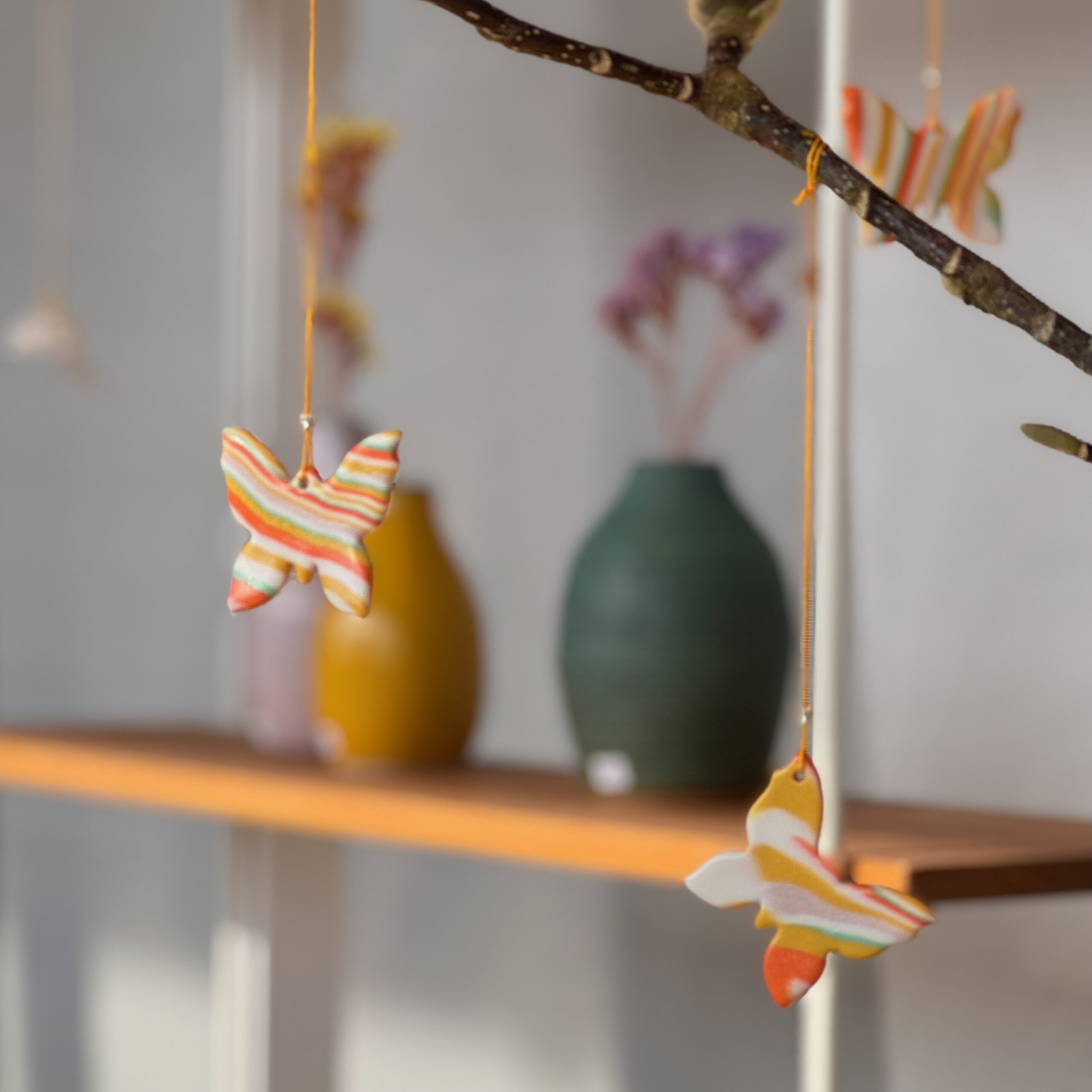 Handgefertigtes Schmetterlingsornament aus durchgefärbtem Porzellan. Die Farben variieren. Nylonschnur mit Glasperle.