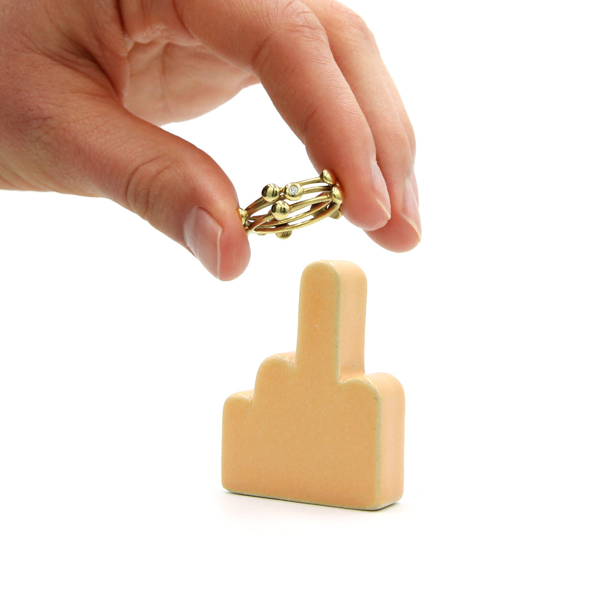 Der Finger, der die Idee ins Rollen brachte. MIDDLE steht für sich allein und zeigt gerade nach oben – ruhig und markant zugleich. Die Form ist schlicht und grafisch und bietet deinen Ringen einen klaren Platz, während sie gleichzeitig einen Hauch von zurückhaltendem Humor verleiht. Lässt sich leicht im Badezimmer, in der Küche und auf dem Nachttisch platzieren.
