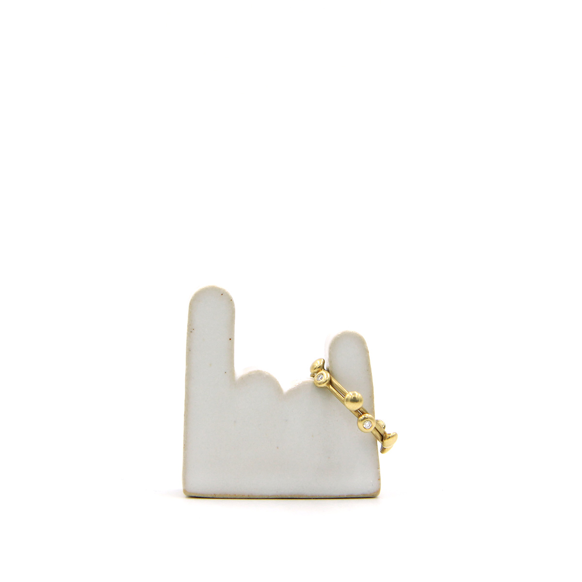 Ein kleines Handzeichen mit Humor und Pfiff. ROCK ON hebt Zeige- und kleinen Finger an und bietet Platz für mehrere Ringe auf einmal. Er ist sowohl praktisch als auch dekorativ – und macht es einfach, deinen Schmuck auf persönliche Weise griffbereit zu haben.