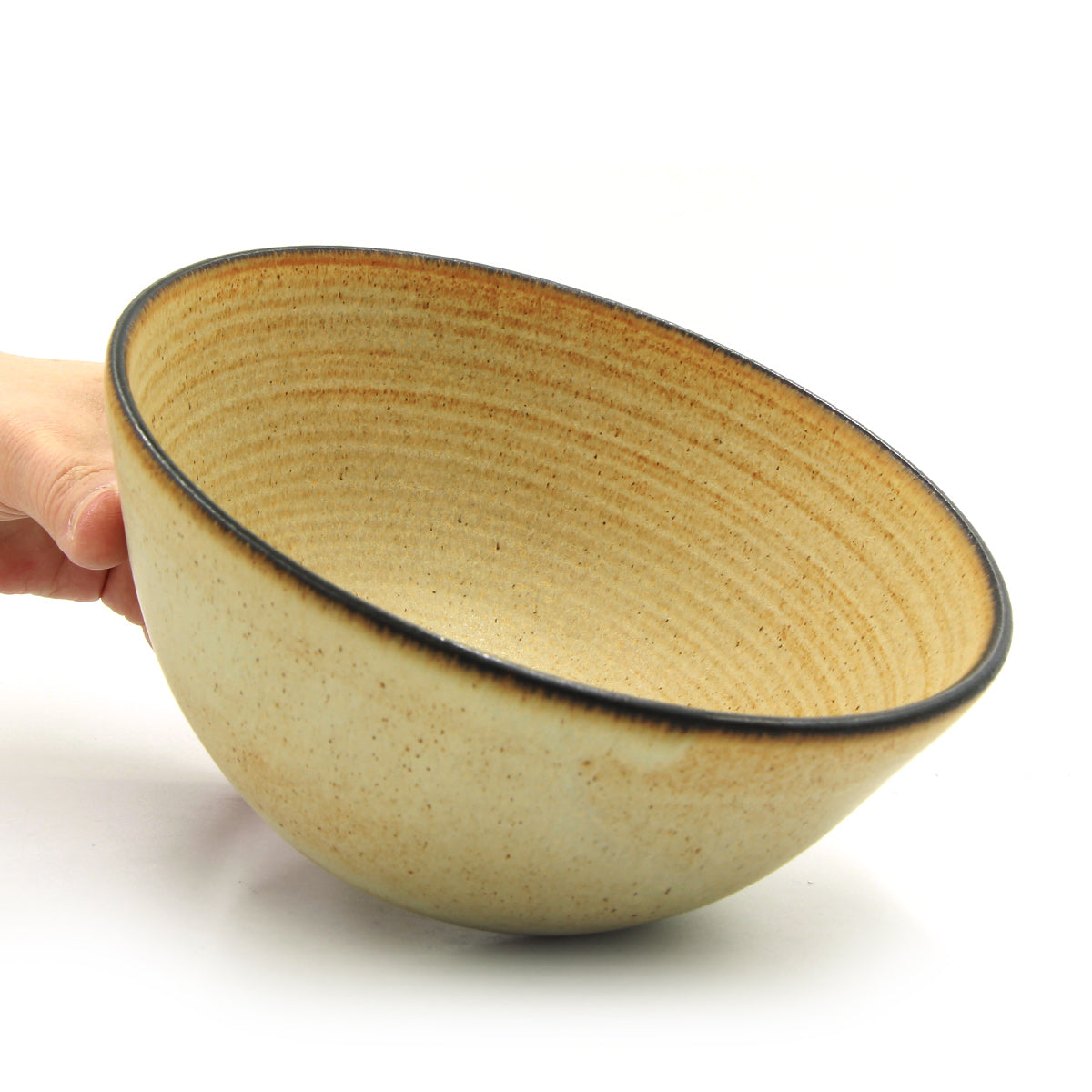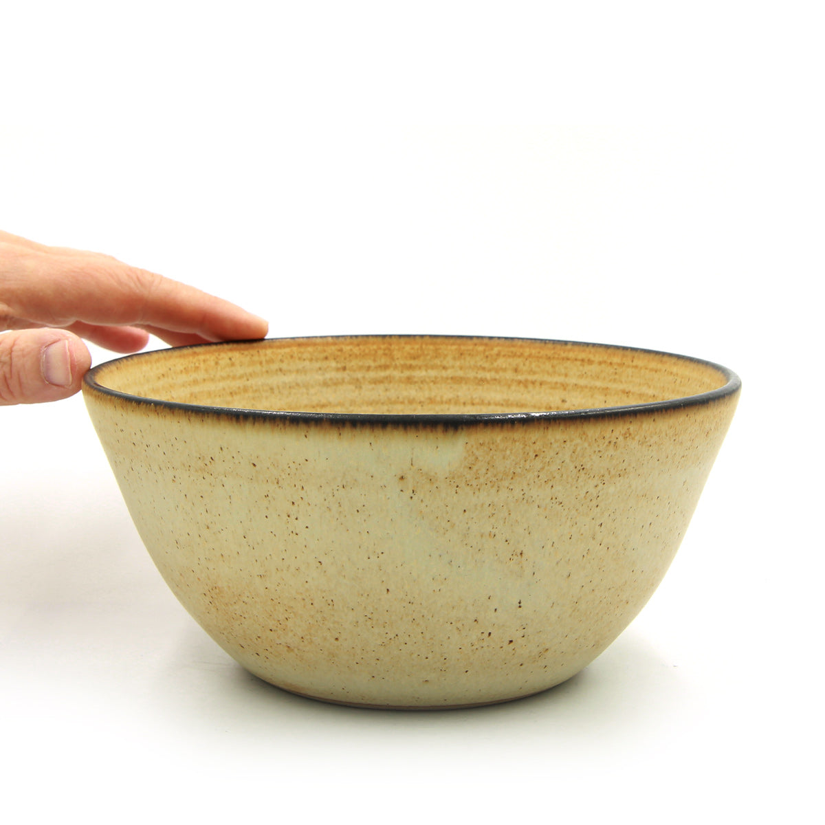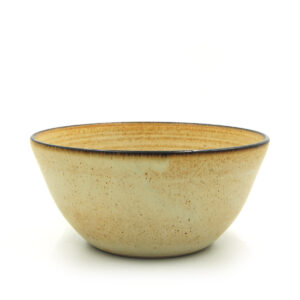 Hier ist die Dark Rim B4 High, eine große, handgedrehte Steingutschüssel mit einem Durchmesser von ca. 18,3 cm und einer Höhe von 8,5 cm. Diese Schüssel ist wunderschön mit einem dunklen Rand verziert, der für die gesamte Dark Rim-Serie charakteristisch ist.