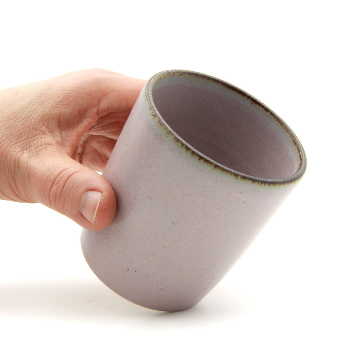 Handgedrehte Steingut-Tasse in Gum-Glasur (Altrosa/helles Lavendel). Mit einem schönen dunklen Rand verziert, der diese Serie auszeichnet.