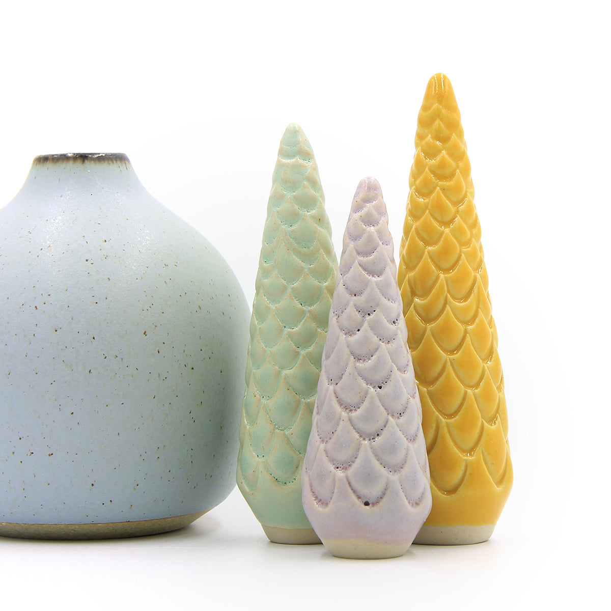 Gungas Pastell-Fichten präsentieren eine spannende Variation der klassischen Fichten, die aus hellem Steingut mit pastellfarbener Glasur gefertigt sind.