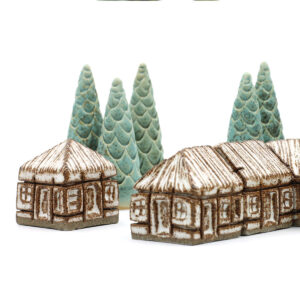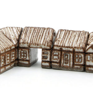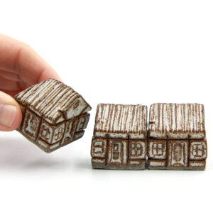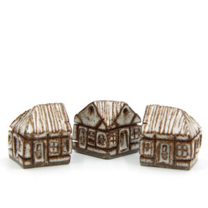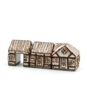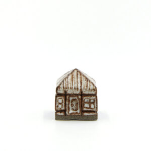 Ein keramisches Fachwerkhaus mit Strohdach, handgefertigt aus dunklem Steingut und mit COCO-Glasur. Die seidenmatte Glasur bringt die feinen Strukturen und handgeschnittenen Details besonders gut zur Geltung. Das Cottage-Haus kommt mit seiner ruhigen Ausstrahlung und seiner abgerundeten Form am besten allein zur Geltung, kann aber auch zusammen mit den anderen Teilen als freistehendes Gebäude im Dorf aufgestellt werden.
