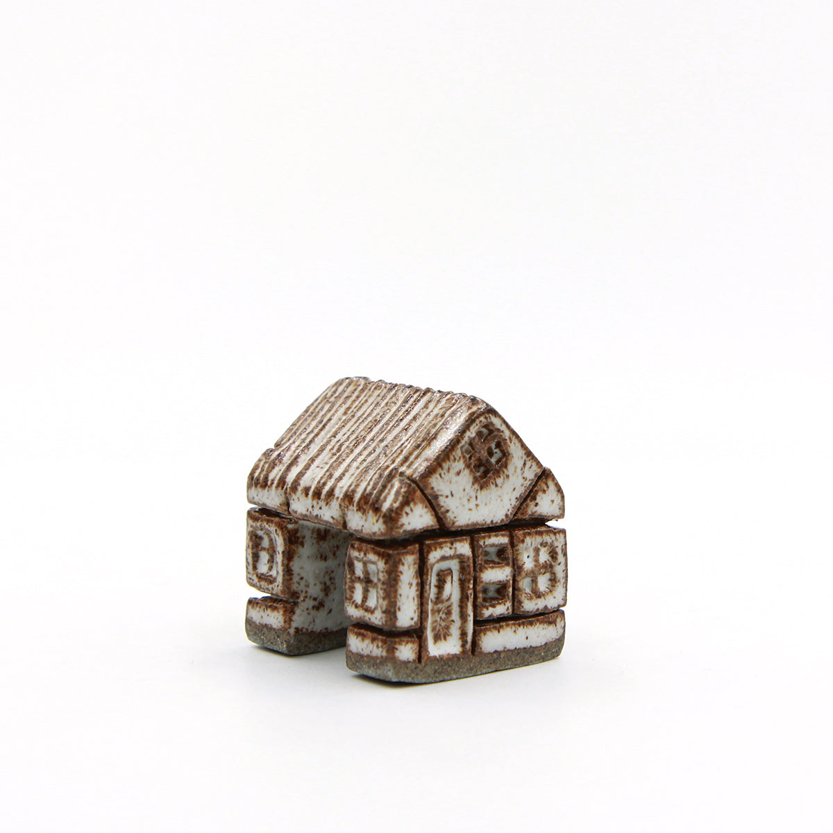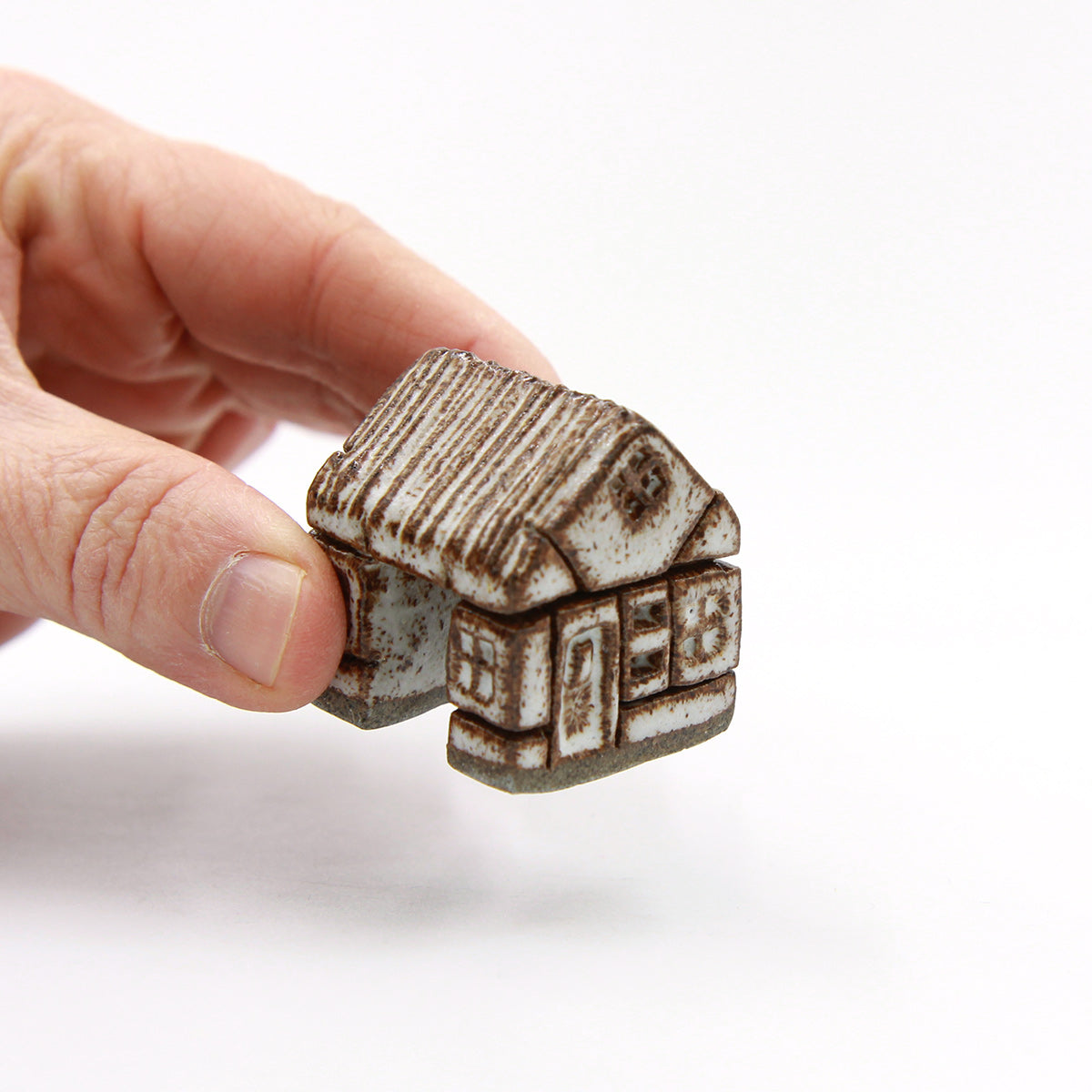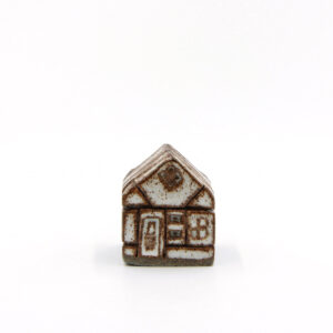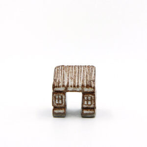 Ein keramisches Fachwerkhaus mit Strohdach und einem breiten Eingang, inspiriert von den alten Bauernhöfen, durch deren Tor Pferdewagen fahren konnten. Handgefertigt aus dunklem Steingut und glasiert in COCO. Die halbglänzende Glasur hebt die Struktur und die Details des Fachwerks hervor. Das Tor dient als Eingang zum Dorf und kann mit Häusern auf beiden Seiten verbunden werden.