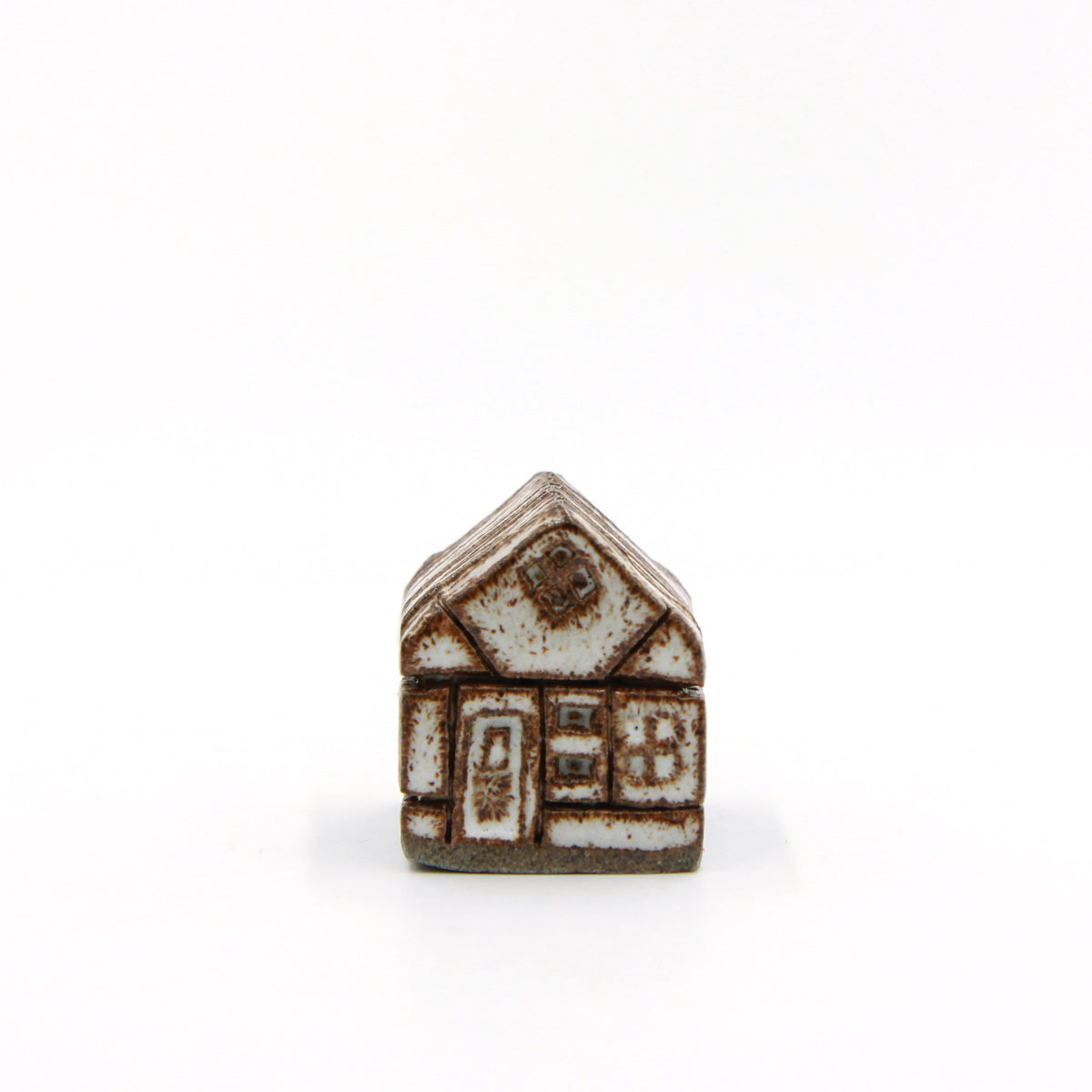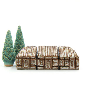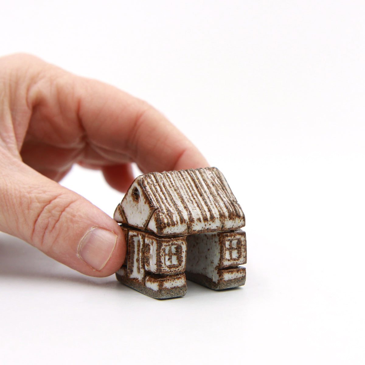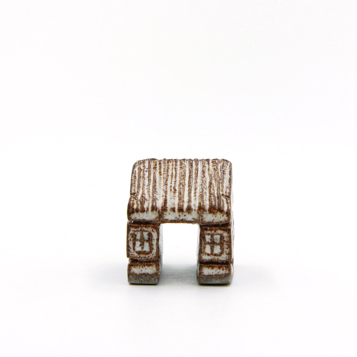 Ein keramisches Fachwerkhaus mit Strohdach und einem breiten Eingang, inspiriert von den alten Bauernhöfen, durch deren Tor Pferdewagen fahren konnten. Handgefertigt aus dunklem Steingut und glasiert in COCO. Die halbglänzende Glasur hebt die Struktur und die Details des Fachwerks hervor. Das Tor dient als Eingang zum Dorf und kann mit Häusern auf beiden Seiten verbunden werden.
