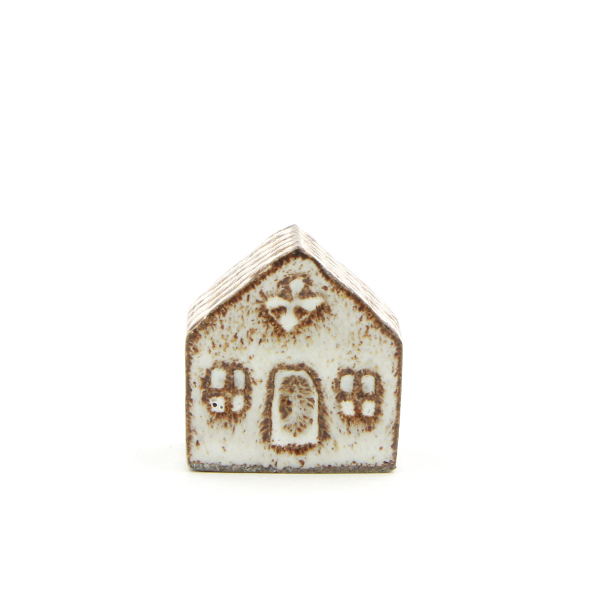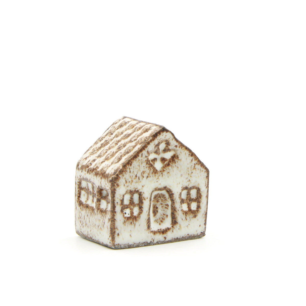 Ein Olufshus in der niedrigen Variante, handgefertigt aus dunklem Steingut und mit COCO-Glasur. Die Glasur sorgt für ein lebendiges Spiel auf der Oberfläche, wobei der dunkle Ton deutlich zur Geltung kommt und Dach, Fenster und Türen mit einem grafischen Ausdruck hervorhebt.