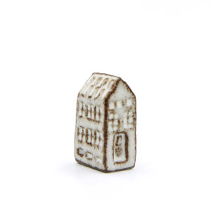 Ein Olufshus in der hohen, schmalen Variante, handgefertigt aus dunklem Steingut und mit COCO-Glasur. Die Glasur sorgt für ein lebendiges Spiel auf der Oberfläche, wobei der dunkle Ton deutlich zur Geltung kommt und Dach, Fenster und Türen mit einem grafischen Ausdruck hervorhebt.