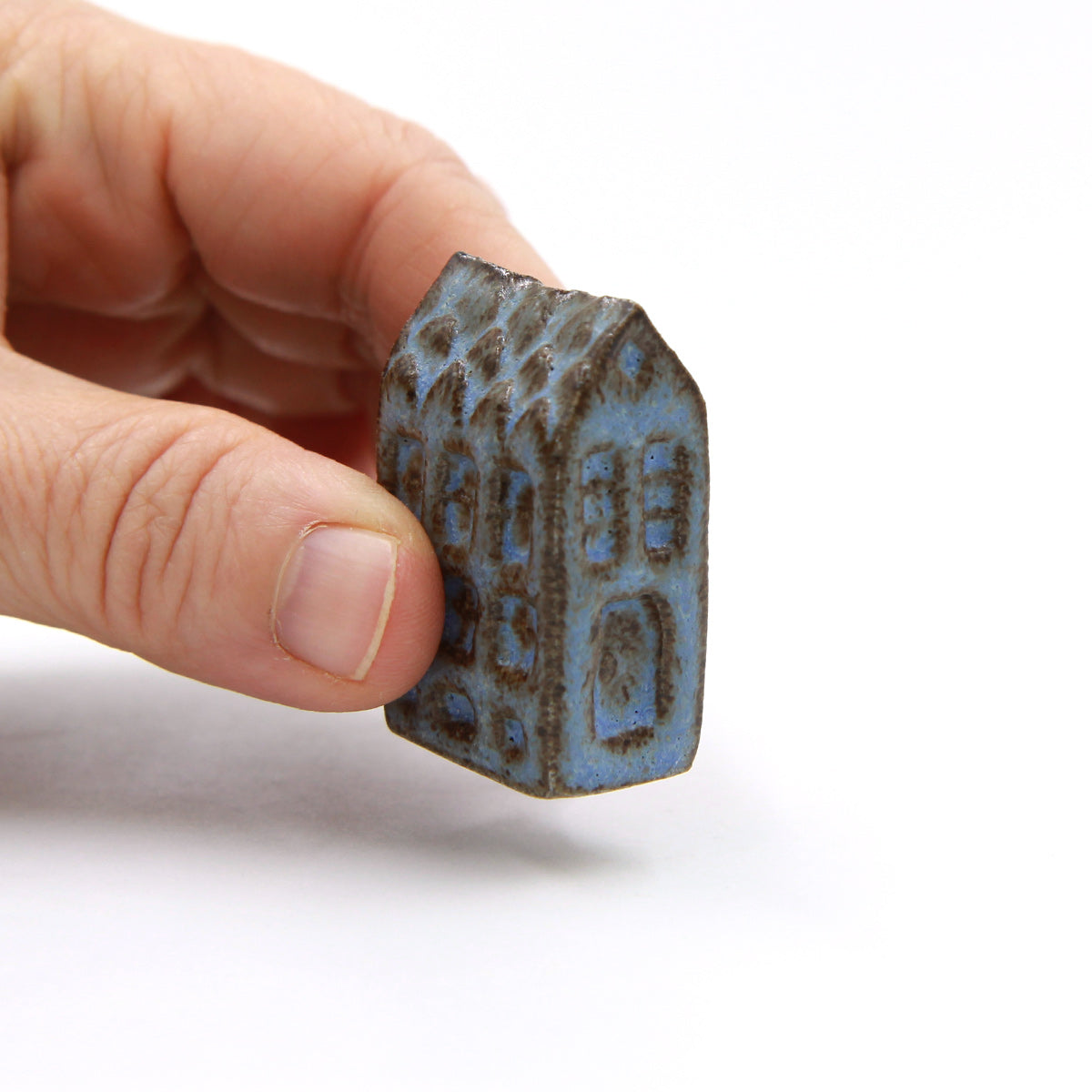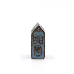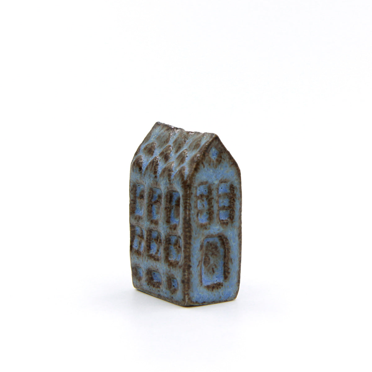 Ein Olufshus in der hohen, schmalen Variante, handgefertigt aus dunklem Steingut und mit AZUL glasiert. Die glänzende Glasur sorgt für ein interessantes Spiel auf der Oberfläche, bei dem der dunkle Ton durch die Glasur hindurchscheint und den handgeformten Details an Dach, Fenstern und Türen Tiefe verleiht.