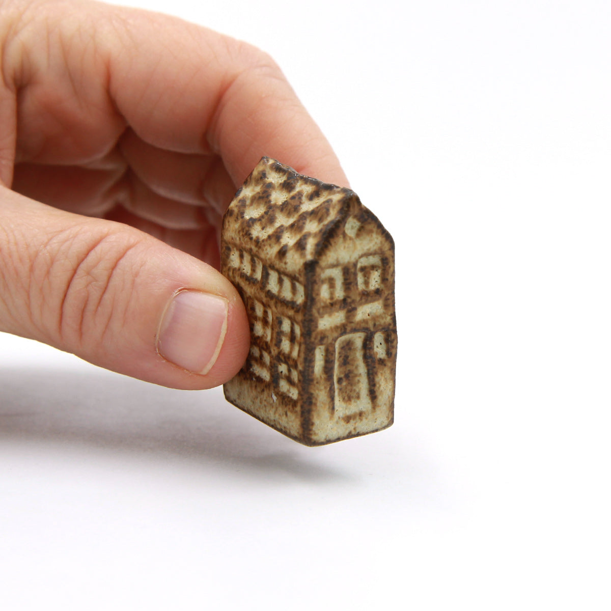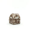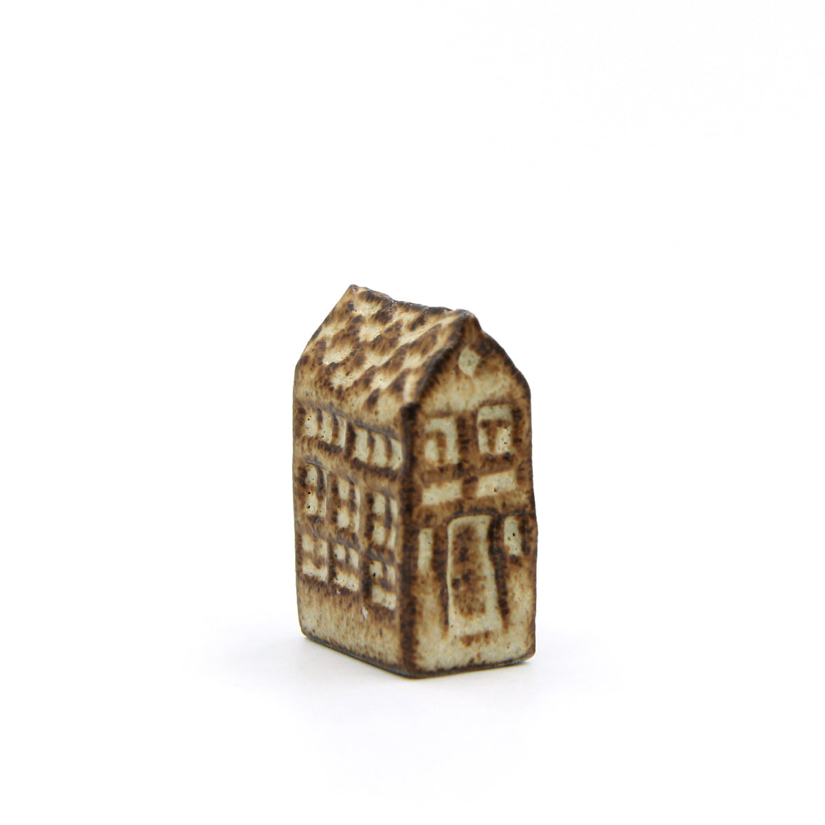 Ein Olufshus in der hohen, schmalen Variante, handgefertigt aus dunklem Steingut und mit CARAMELO glasiert. Die matte Glasur sorgt für ein interessantes Spiel auf der Oberfläche, bei dem der dunkle Ton durch die Glasur hindurchscheint und den handgeformten Details an Dach, Fenstern und Türen Tiefe verleiht.