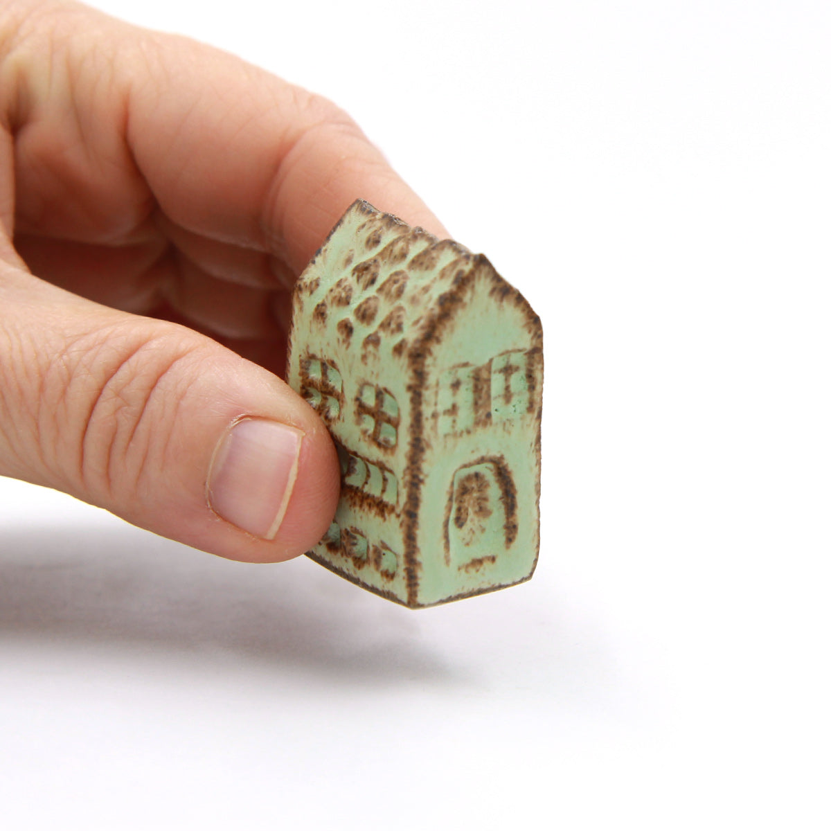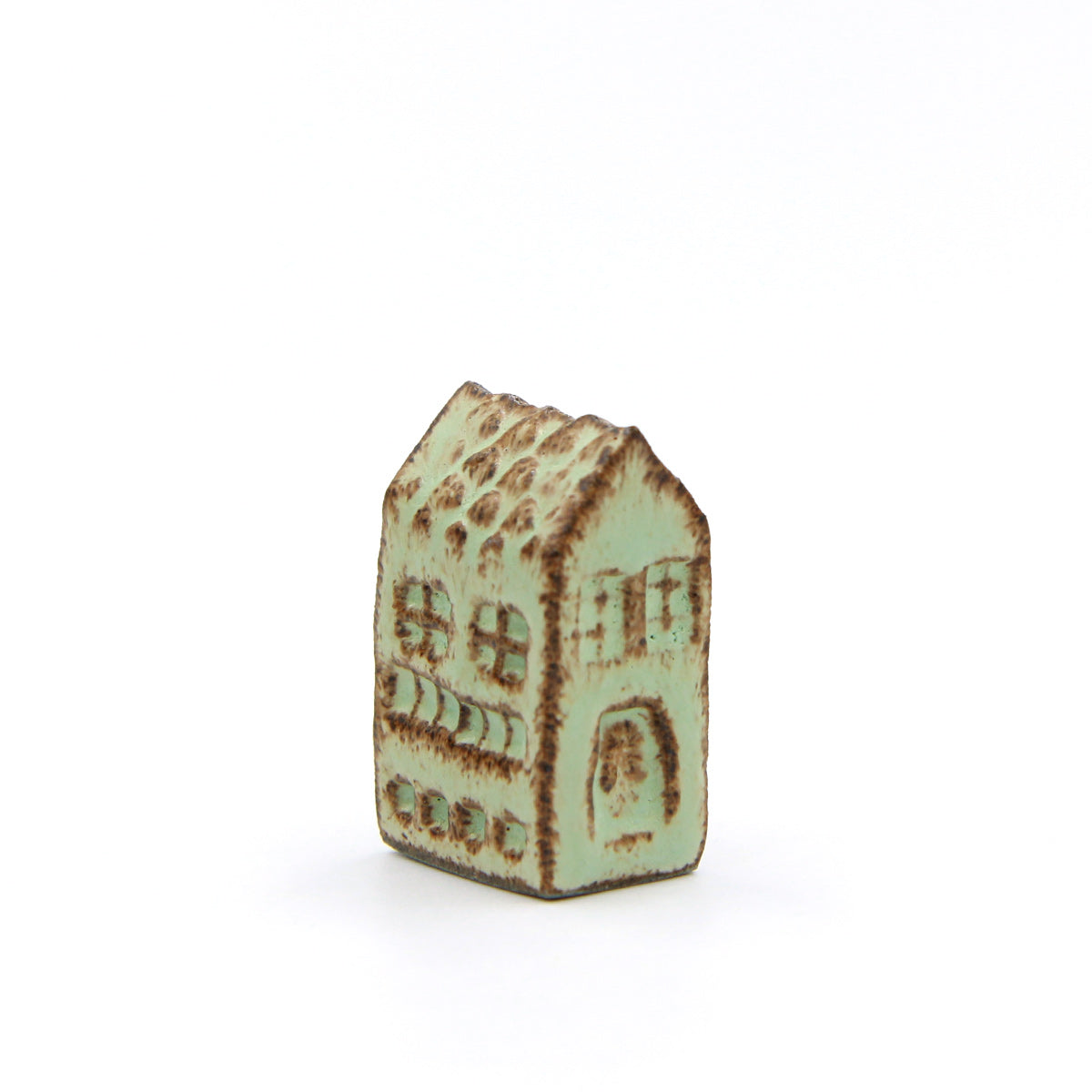 Ein Olufshus in der hohen, besonders schmalen Variante, handgefertigt aus dunklem Steingut und mit einer MINT-Glasur versehen. Die glänzende Glasur sorgt für ein interessantes Spiel auf der Oberfläche, bei dem der dunkle Ton durch die Glasur hindurchscheint und den handgeformten Details an Dach, Fenstern und Türen Tiefe verleiht.