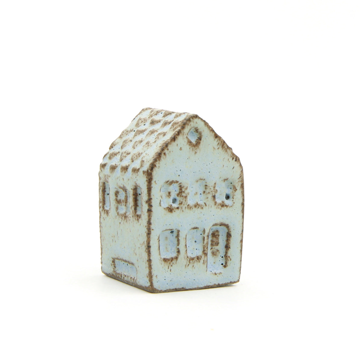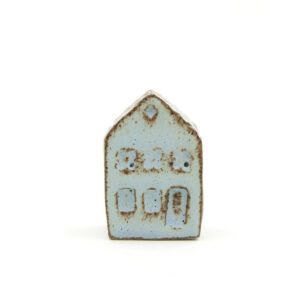 Ein Olufshus in der hohen, schmalen Variante, handgefertigt aus dunklem Steingut und mit CIELO-Glasur überzogen. Die glänzende Glasur sorgt für ein interessantes Spiel auf der Oberfläche, bei dem der dunkle Ton durch die Glasur hindurchscheint und den handgeformten Details an Dach, Fenstern und Türen Tiefe verleiht.
