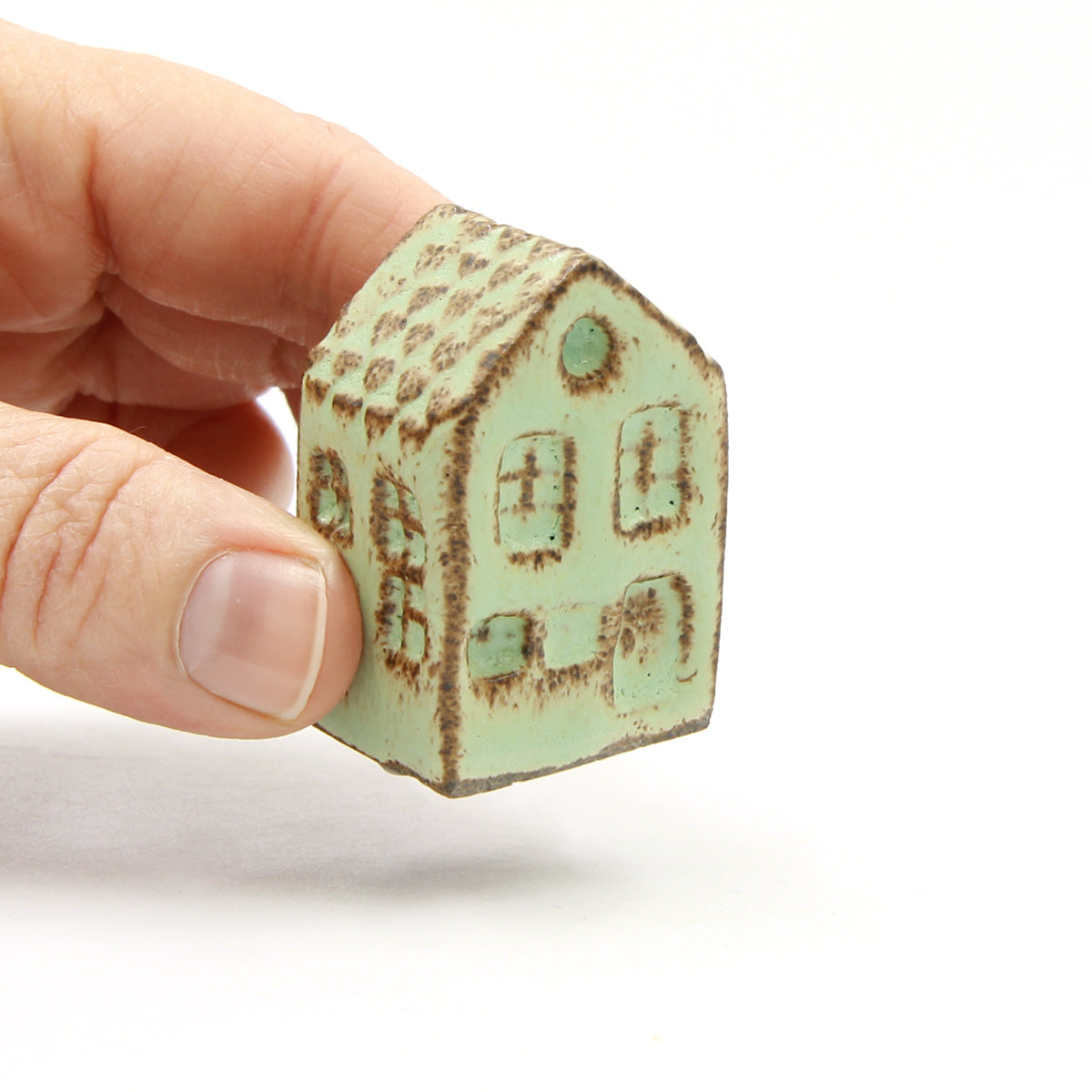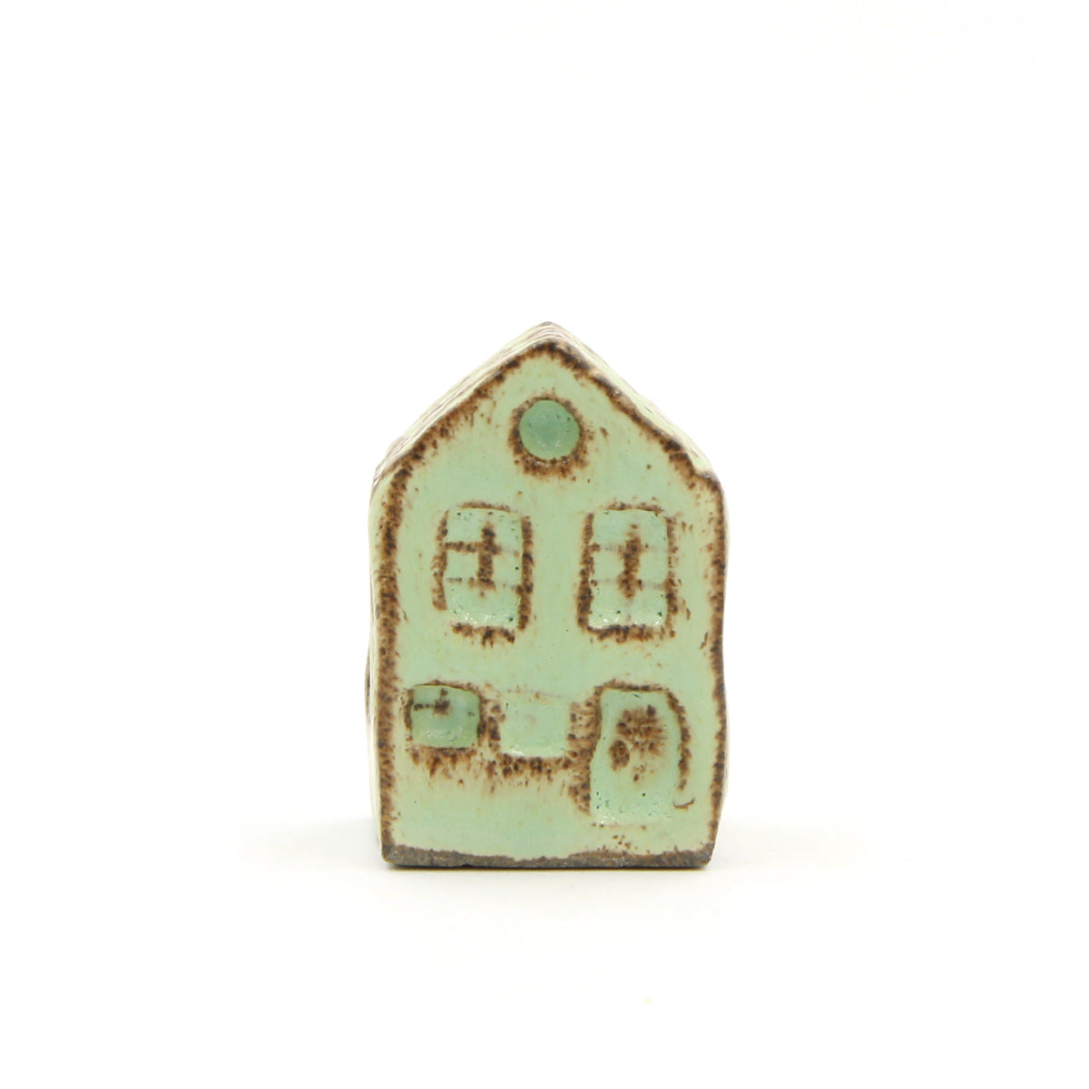 Ein Olufshus in der hohen, schmalen Variante, handgefertigt aus dunklem Steingut und mit MINT-Glasur überzogen. Die glänzende Glasur sorgt für ein interessantes Spiel auf der Oberfläche, bei dem der dunkle Ton durch die Glasur hindurchscheint und den handgeformten Details an Dach, Fenstern und Türen Tiefe verleiht.