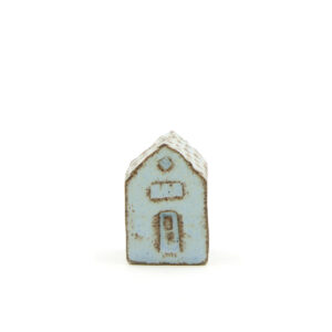 Ein Olufshus in der kleinen, schmalen Variante, handgefertigt aus dunklem Steingut und mit CIELO-Glasur. Die Glasur sorgt für ein lebendiges Spiel auf der Oberfläche, wobei der dunkle Ton deutlich zur Geltung kommt und Dach, Fenster und Türen mit einem grafischen Ausdruck hervorhebt.