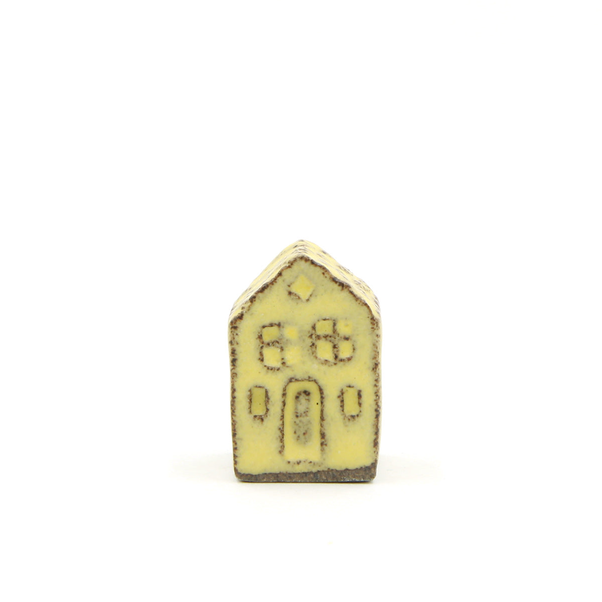 Ein Olufshus in der kleinen, schmalen Variante, handgefertigt aus dunklem Steingut und in der Farbe CITRON glasiert. Die Glasur sorgt für ein lebendiges Spiel auf der Oberfläche, wobei der dunkle Ton deutlich zur Geltung kommt und Dach, Fenster und Türen mit einem grafischen Ausdruck hervorhebt.