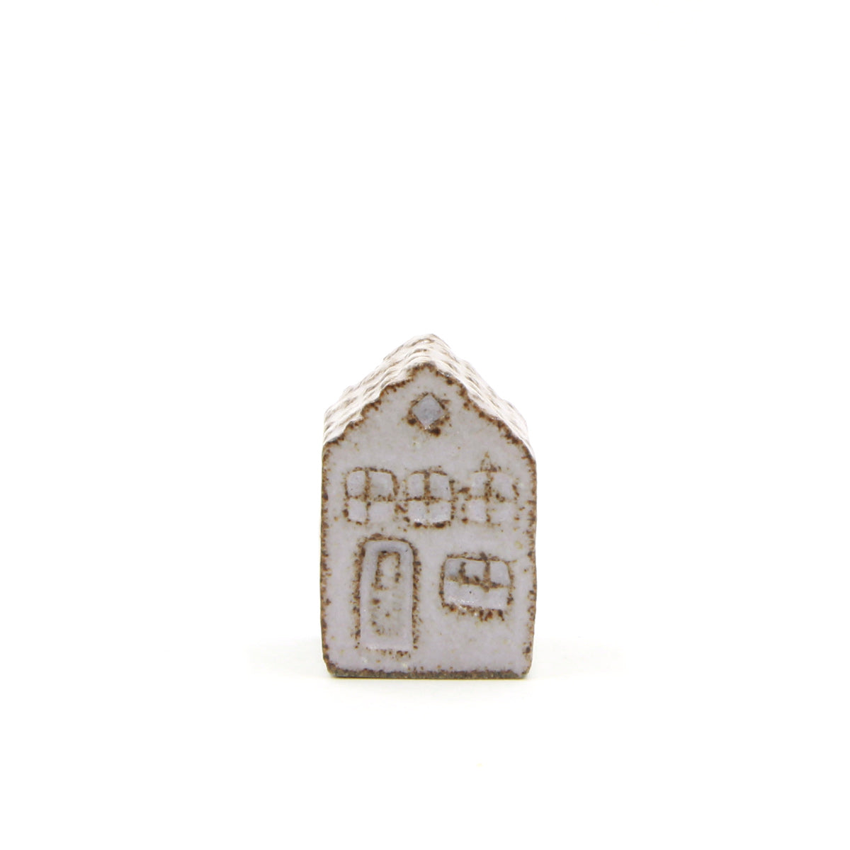 Ein Olufshus in der kleinen, schmalen Variante, handgefertigt aus dunklem Steingut und mit GUM-Glasur überzogen. Die Glasur sorgt für ein lebendiges Spiel auf der Oberfläche, wobei der dunkle Ton deutlich zur Geltung kommt und Dach, Fenster und Türen mit einem grafischen Ausdruck hervorhebt.