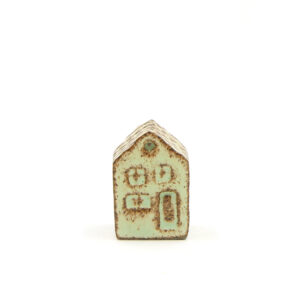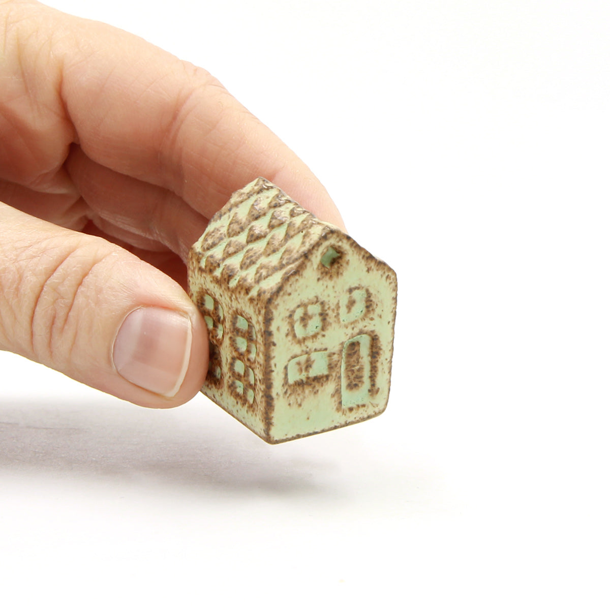 Ein Olufshus in der kleinen, schmalen Variante, handgefertigt aus dunklem Steingut und mit MINT-Glasur. Die Glasur sorgt für ein lebendiges Spiel auf der Oberfläche, wobei der dunkle Ton deutlich zur Geltung kommt und Dach, Fenster und Türen mit einem grafischen Ausdruck hervorhebt.