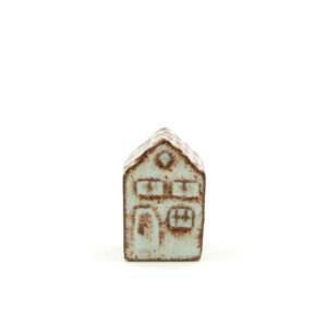 Ein Olufshus in der kleinen, schmalen Variante, handgefertigt aus dunklem Steingut und mit NUBE glasiert. Die Glasur sorgt für ein lebendiges Spiel auf der Oberfläche, wobei der dunkle Ton deutlich zur Geltung kommt und Dach, Fenster und Türen mit einem grafischen Ausdruck hervorhebt.