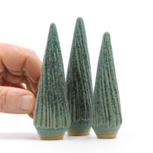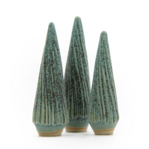 Wenn du einen Baum kaufst, investierst du in ein kleines Kunstwerk, das zu 100 % aus recyceltem Material hergestellt wurde. Ausgetrockneter Ton aus anderen Produktionen wird sorgfältig wiederverwendet. Die Tannenbäume werden zusammen mit anderen Werkstücken vorgebrannt und fertig gebrannt, um den Platz bei jedem Brennvorgang optimal zu nutzen. Das erfordert sorgfältige Planung und Zeit, spart aber wertvolle Ressourcen.