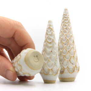 Wenn du einen Baum kaufst, investierst du in ein kleines Kunstwerk, das zu 100 % aus recyceltem Material hergestellt wurde. Ausgetrockneter Ton aus anderen Produktionen wird sorgfältig wiederverwendet. Die Tannenbäume werden zusammen mit anderen Werkstücken vorgebrannt und fertig gebrannt, um den Platz bei jedem Brennvorgang optimal zu nutzen. Das erfordert sorgfältige Planung und Zeit, spart aber wertvolle Ressourcen.