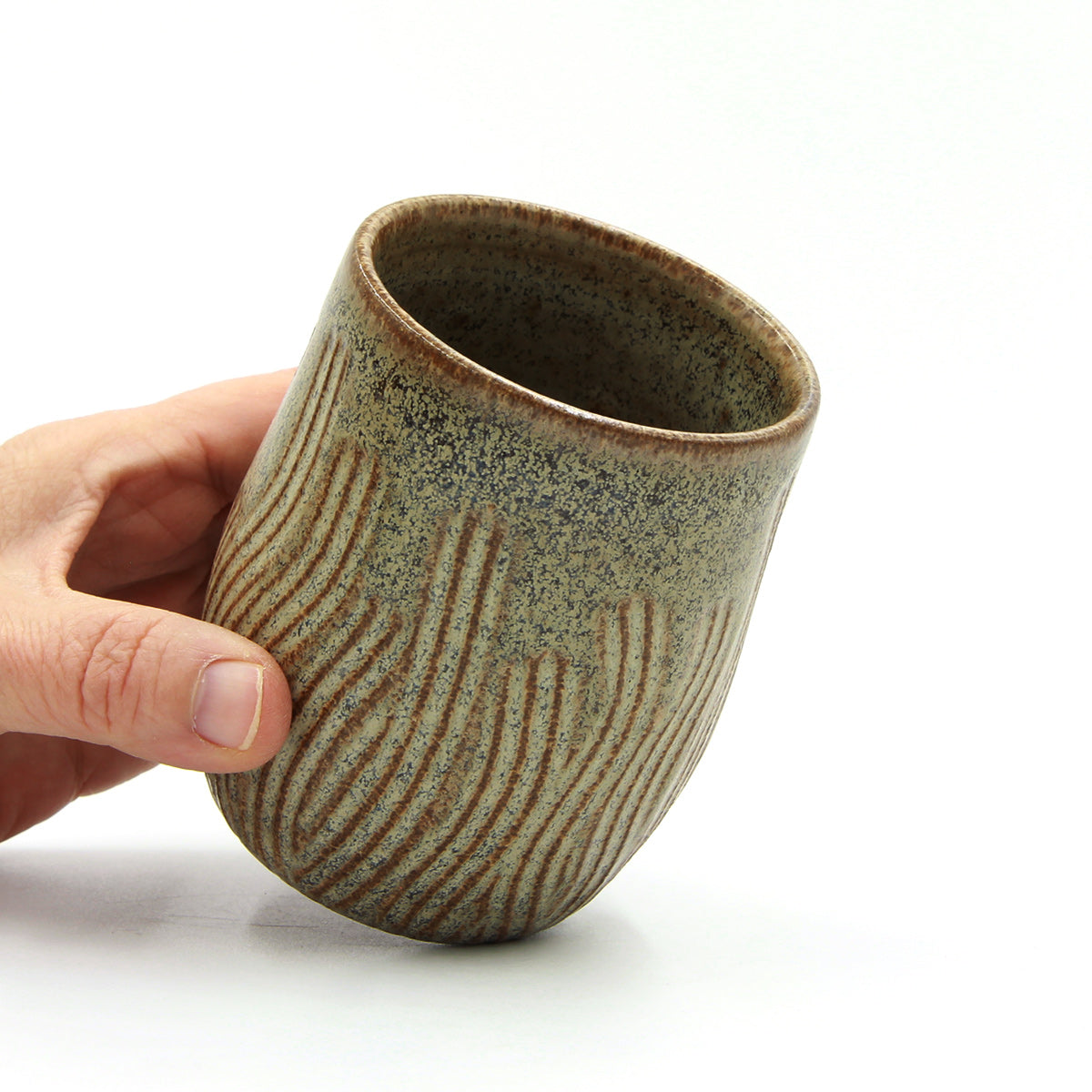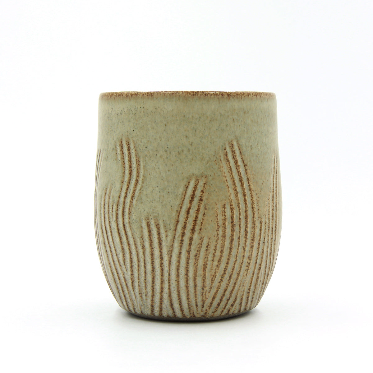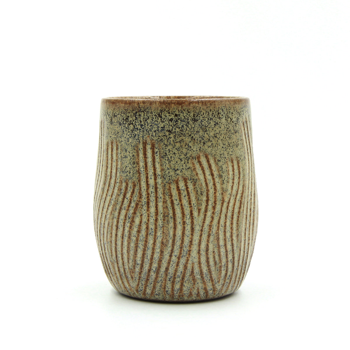 Handgedrehte Becher mit detaillierten geschnitzten Mustern, die sie nicht nur schön anzusehen, sondern auch angenehm zu halten machen. Perfekt für jeden Tee- oder Kaffeeliebhaber.