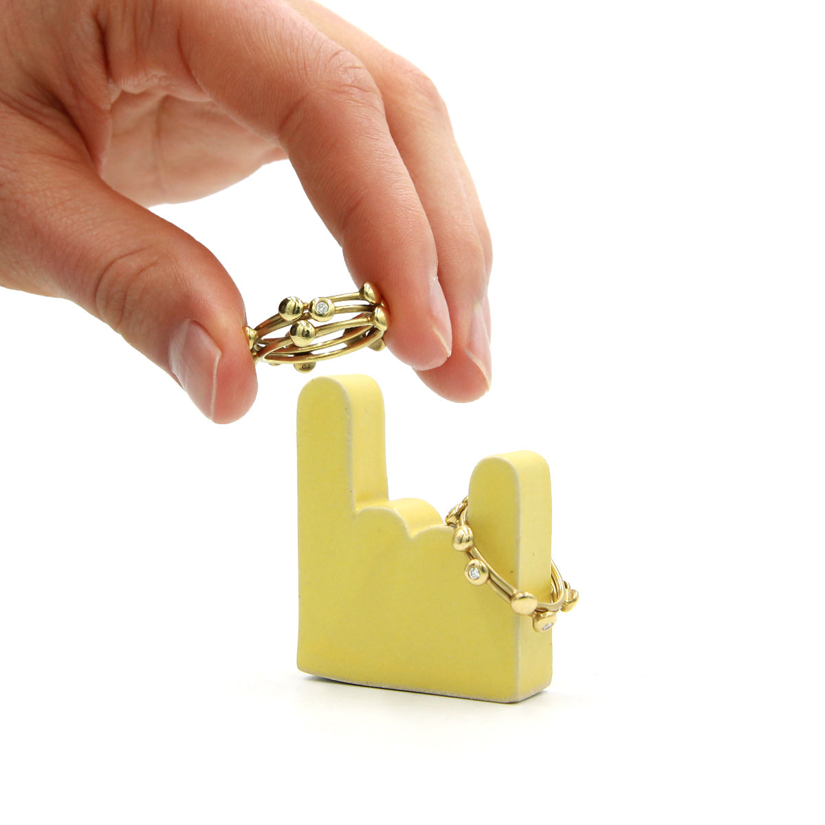 Et lille håndtegn med humor og kant. ROCK ON løfter pege- og lillefingeren og giver plads til flere ringe på én gang. Den er både praktisk og dekorativ – og gør det nemt at have smykkerne liggende fremme på en personlig måde.