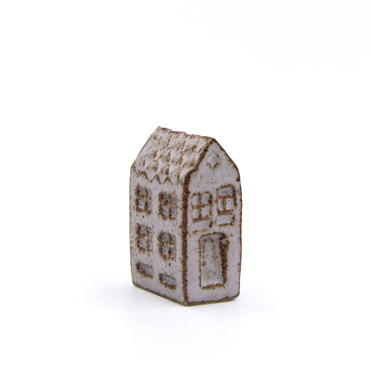 Et Olufshus i den høje smalle variant, håndlavet i mørkt stentøj og glaseret i GUM. Den silke-matte glasur skaber et spil i overfladen, hvor den mørke ler træder frem gennem glasuren og giver dybde til de håndskårne detaljer i tag, vinduer og døre.